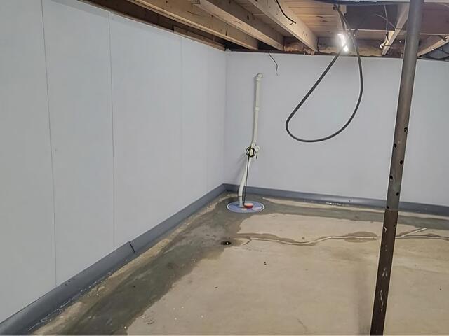 This basement in Mount Vernon, KY, had a monolithic foundation, and water seeped in and left dark stains along the walls. We installed a two-stage waterproofing system using DryTrak against the wall to capture seepage and a perforated drain a couple feet in from the floor to handle groundwater. Both connect to a new SuperSump pump for reliable discharge. BrightWall panels finished the job by covering the stained walls and giving the basement a clean, bright look.