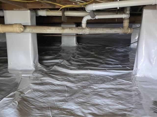 To help this homeowner save money on energy bills, breathe cleaner air, and preserve their foundation, we encapsulated their crawl space with our CleanSpace vapor barrier. By sealing the space off from moisture and installing a dehumidifier, (not pictured) we were able to help transform this Lexington, KY, crawl space. Our vapor barrier is made of an antimicrobial material to prevent mold growth. It is also 20 milliliters thick to prevent the system from ripping.