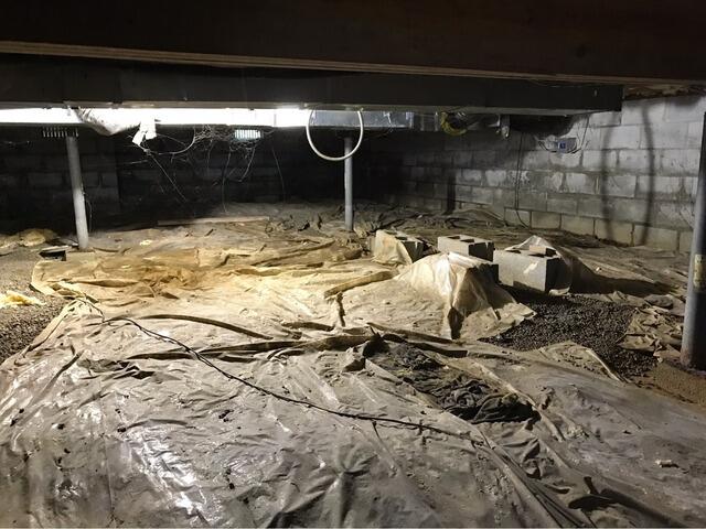 This vented crawl space was allowing wet air to enter in the Spring and Summer, and it was allowing for cold air to enter in the Winter and Fall. The wet air had destroyed the fiberglass insulation, damaged the wood, and caused musty smells. The cold air caused cold floors and higher energy bills in the winter. By encapsulating the crawl space with our CleanSpace moisture barrier, our SmartSump sump pump, and our SaniDry Sedona dehumidifier, we were able to completely change the look, feel, and smell of the crawl space.