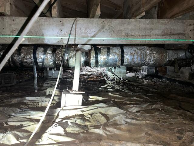 A homeowner in Danville reached out to us after noticing that their floors had started to sag in several areas. During our initial inspection, we used a laser level to project a line across the main beam, which clearly showed that the beam was dipping in multiple spots. The issue stemmed from settling support beneath the home — a common problem in older crawl spaces where moisture and soil movement gradually weaken the structure.