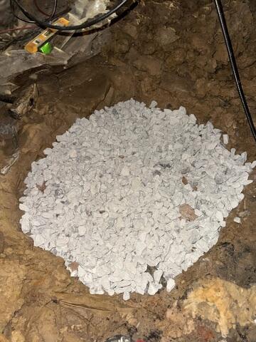 To restore the home’s stability, our crew installed four SmartJacks directly beneath the main beam to bring the floor system back to level. Each SmartJack installation followed a precise process designed to ensure long-term support. We began by digging a deep hole for each support, then filling the base with crushed limestone to create a solid, load-bearing foundation. The limestone was compacted thoroughly before we set the galvanized steel base plate in place.
