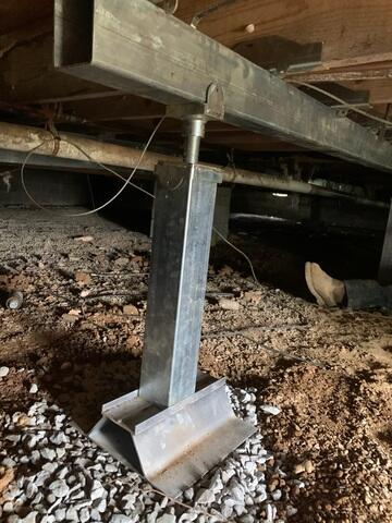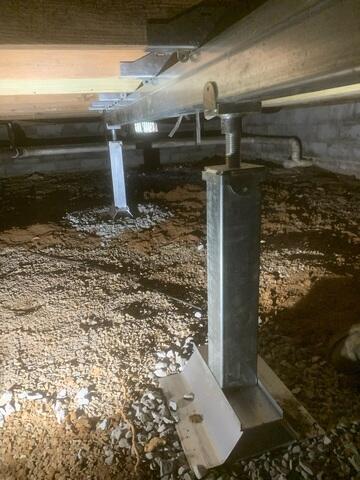 This crawl space in Stanford, Kentucky, was sinking, causing the floors above to sag as well. We repaired the sinking floor by installing our SmartJack post system in the crawl space. These posts were able to level out the floors above thanks to their unique engineer filled base. Each base was built by digging a hole a few feet deep, and then backfilling the hole with limestone. This base will also ensure that the jacks won't sink in the future.