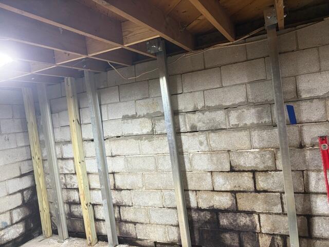 This basement in Carlisle, KY, had a couple foundation walls that needed repaired. The damaged walls were actively shifting laterally inwards towards the inside of the basement due to built up hydrostatic pressure in the soil outside the home. We braced the walls with our PowerBraces in order to stabilize them. Our PowerBraces are made of galvanized steel to help prevent rusting. These braces don't just stabilize the wall, they can also be tightened throughout time through their specially designed top brackets to help straighten the wall back out. These specially designed top brackets have different variations depending on whether or not the floor joists in the ceiling are running perpendicular or parallel to the wall, (as seen in the attached photos). This helps us prevent floor joist/ceiling damage for when we tighten the braces on annual visits. The homeowner was very happy with our crews attention to detail and their communication skills.