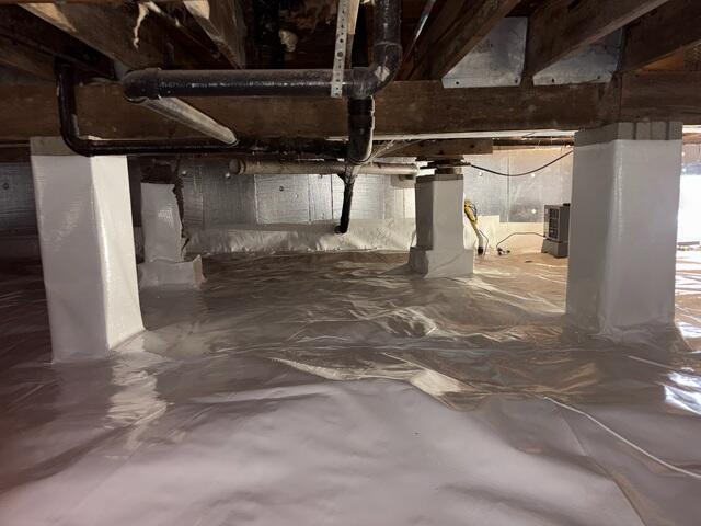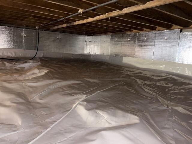This wet crawl space in Richmond, KY, was emitting musty odors into the living space above. The homeowners contracted us to come out and repair it with a proper encapsulation system. We started by trenching around the perimeter of the crawl space into the floor to make room for a drainage system. After fitting the trenches with perforated drainage tile, we then hooked up our SmartSump sump pump system in the crawl space to manage all the groundwater. To help the waterproofing system, we then nailed our dimpled drainage matting all across the floor, which will help provide an additional layer between the wet ground and the vapor barrier, (which we installed over the top of the drainage matting later in the process). Next, we aligned the crawl space walls with our SilverGlo insulation panels. These panels are made of graphite, (an antimicrobial material) which help reflect heat back into the controlled environment. These panels allowed us to go ahead and rip out all the existing fiberglass insulation. To finish the project, we wrapped the entire floor, all the concrete columns, and the walls with our CleanSpace vapor barrier. This vapor barrier was sealed everywhere with a strong tape to ensure moisture has no entry points into the space. Lastly, we installed our SaniDry Sedona dehumidifier to keep the sealed air in the space as dry and clean as possible. The homeowners were very happy with the outcome, and they noticed an immediate difference in the air quality throughout the rest of their home.