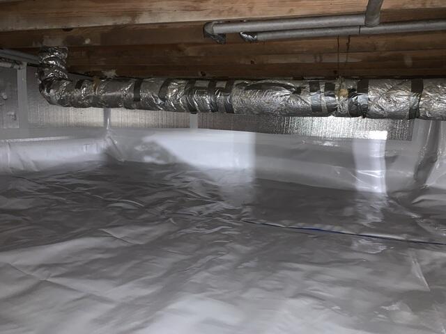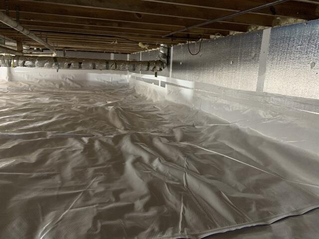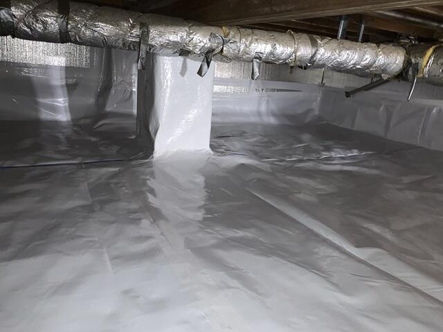 Our crew installed a full CleanSpace encapsulation system to seal the crawl space and prevent outside air and moisture from entering. To improve energy efficiency, we also installed SilverGlo insulation along the walls. Finally, a SaniDry Sedona dehumidifier (not pictured) was added to keep humidity levels under control year-round.